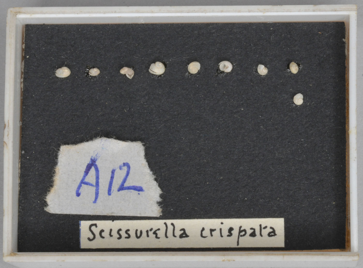 Class: Gastropoda. 9 specimens. Minute, white, thin shell with between 2-5 whorls and a 'slit' through the outer lip. Found by dredging at 8-2000m in stone, shell or gravel sea floors.