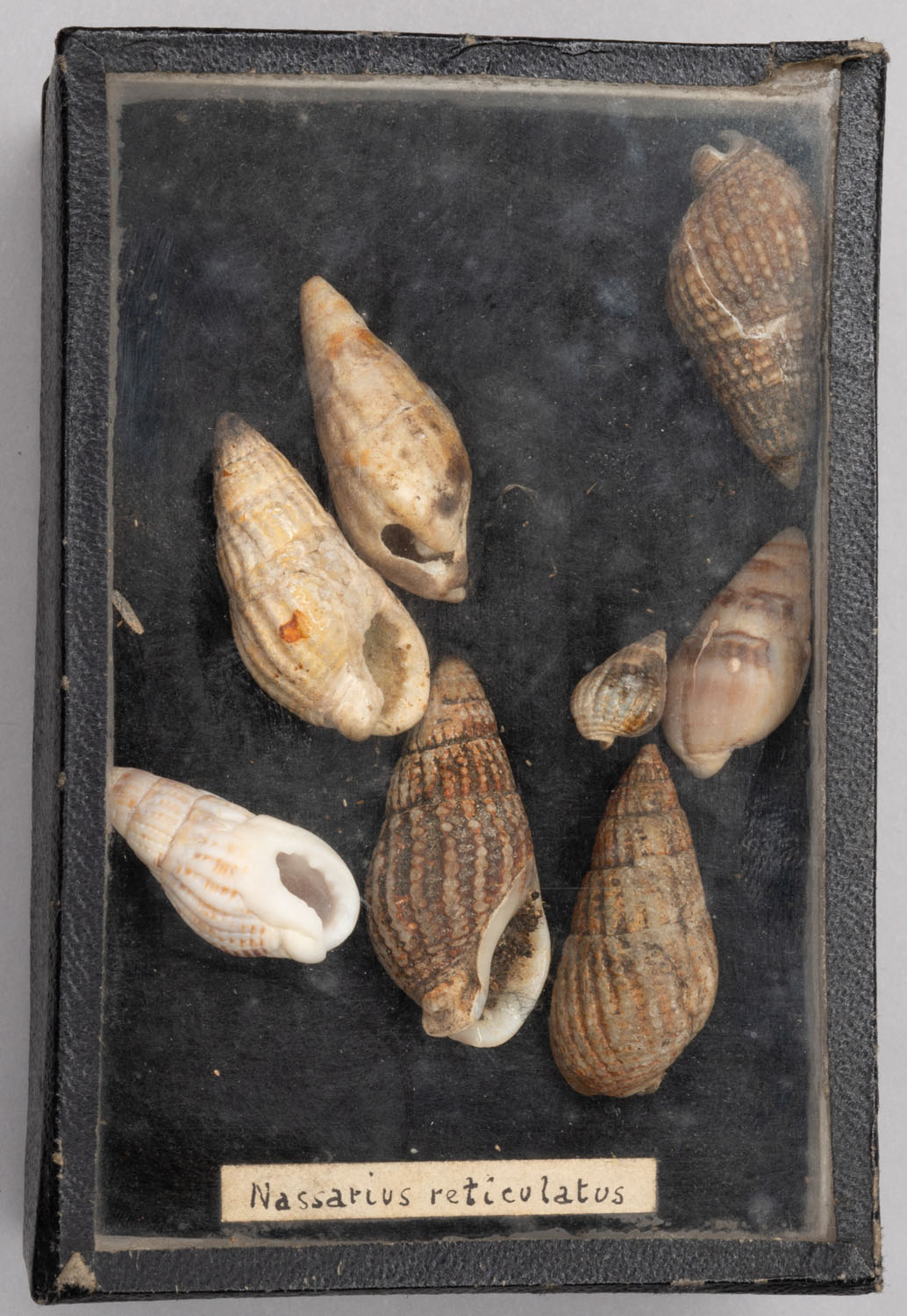 Class: Gastropoda. 8 specimens. Spire shaped with relatively flat whorls but very distinctive 'netting' ridges covering the outer surface. Rounded apex, fairly thick, tough shells. Ranging in colour from lighter cream to sandy to browns. Found on many rocky shores and sublittoral.