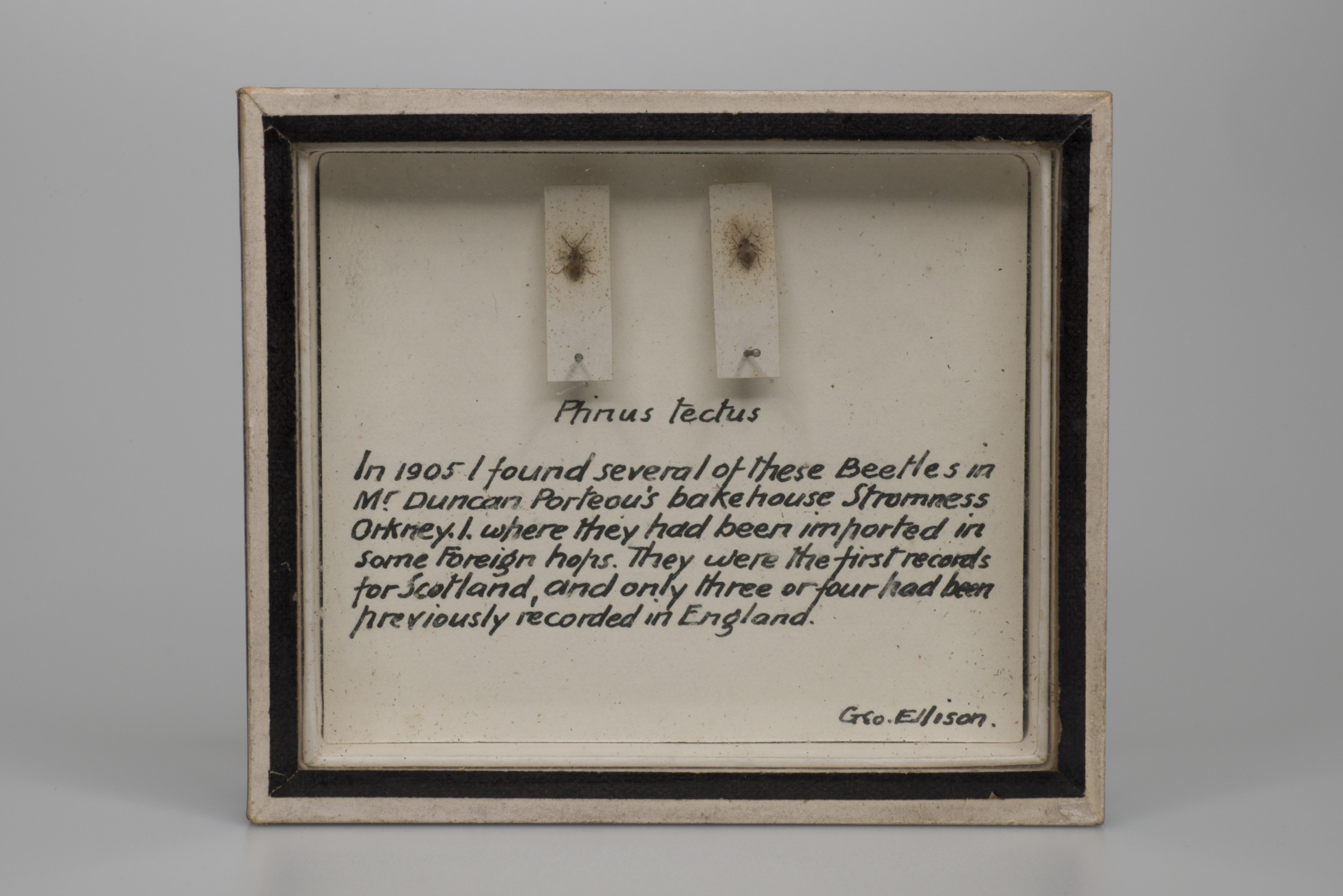 Two mounted specimens found among imported hops in Mr Duncan Porteous bakery, Stromness. First record for Scotland, only 3 or 4 found in England, 1905.