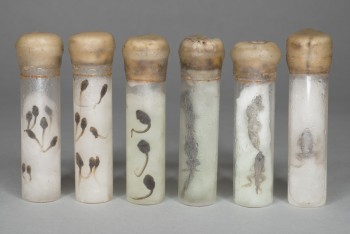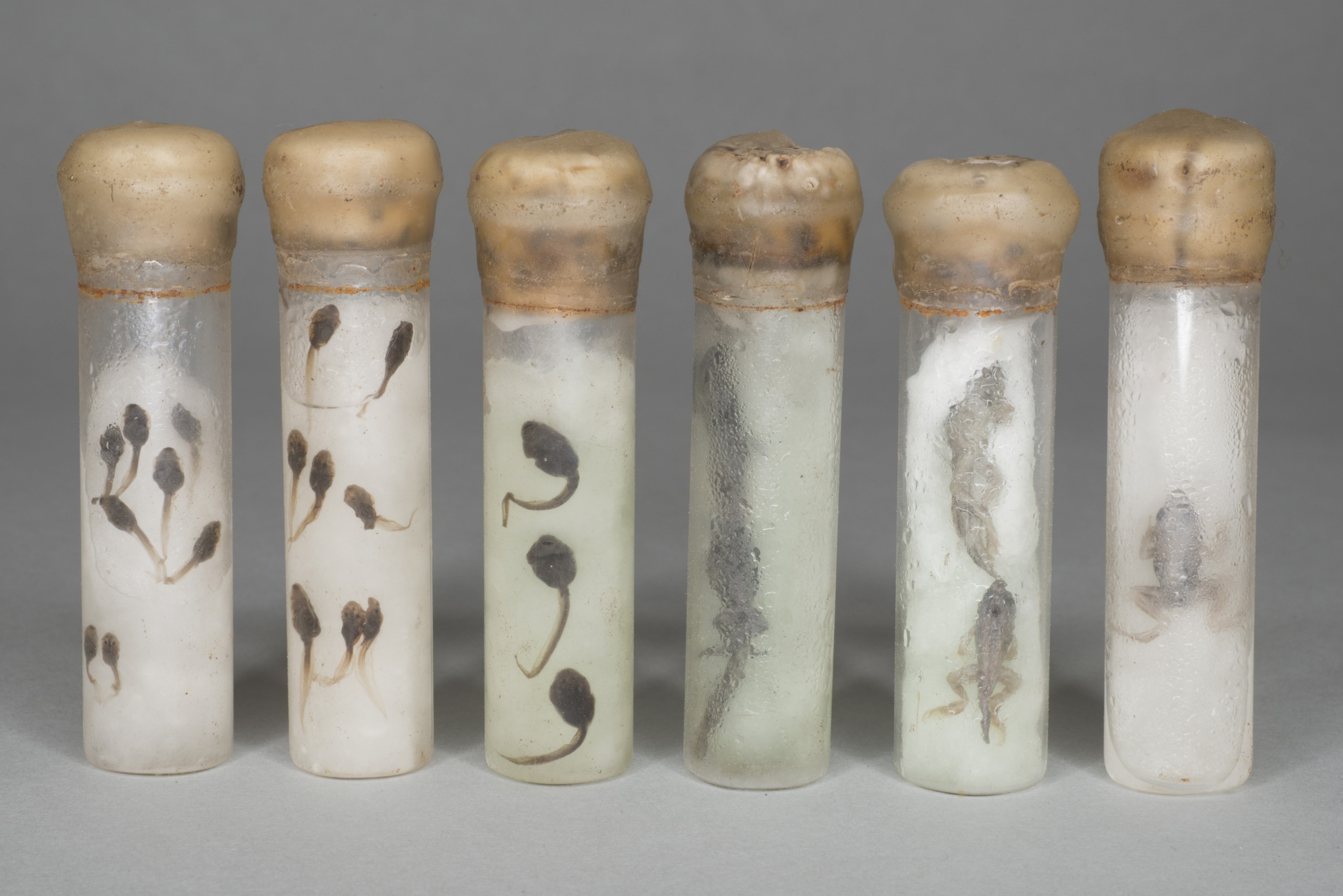 Toad: six glass phials containing specimens illustrating the development of tadpole to toad.