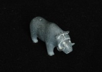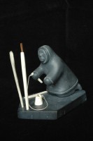 Dark grey or black carving in soapstone of an Inuit figure fishing. He has caught a white fish through a hole in the ice with a hand held fishing line.
