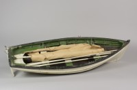 Model of a clinker built yole. Painted white with a black line along the top and brown inside. A white mast, 2 rollocks for pivoting the oar, two white oars and 4 seats inside.