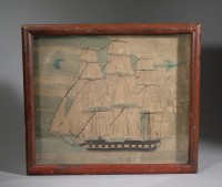 Needlework picture. British naval man-o'-war with open gun ports. In box frame. Formerly in Skaill House. Very faded.