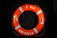 Lifebelt: orange plastic ship's lifebelt, painted 'ST OLA ABERDEEN' with P & O Flag and Old Man of Hoy. From St Ola IV.
