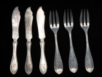 Three fish forks and three fish knives. Silver colour with monogram on handle. "R B T A " arranged on a sectioned square.