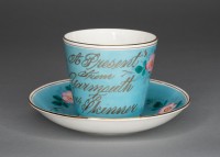 Tea cup, white china hand painted pink flowers on a blue ground. Gold lettering ' A Present from Yarmouth to Mrs Skinner'.