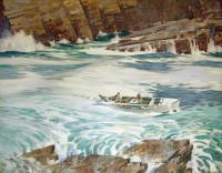 Oil painting of Stromness fishermen William Linklater and Robert Greig guiding their Yole "Margaret" into her summer haven at Yesnaby in the 1920s.