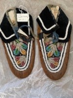 Moccasins, beaded, pair. Leather moccasins with raised bead floral pattern. Ankle tie with faded blue trim.