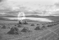 The Kemps of Little Barnhouse, Stenness, gathering in the sheaves, date unknown. The Standing Stones Hotel and Stenness Loch can be seen in the background.