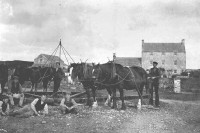 Copy negative showing a 'horse gang', for threshing grain, at Bu', Burray, c. 1908. On the right is George Kennedy of the Bu'.