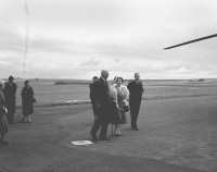 The Queen Mother arriving at Kirkwall Airport during a visit to open the King George V Playing Fields at Pickaquoy, 9th August 1956.