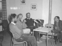 Crew of the sailing cutter 'Maid Nellie' being interviewed by Gerry Meyer, editor of the Orcadian newspaper, 1959. L-R: Jon Field, Leslie Shephard, David Regan (Skipper) & Gerry Meyer.