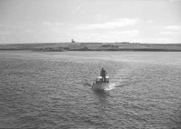 A small boat leaving Egilsay, with St. Magnus Church in the background, c.1950s.