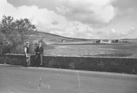Two men passing the time of day in Finstown, with Firth School in the background, c.1950s.