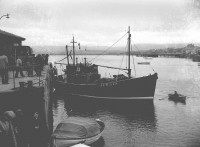Stromness Harbour at 5am on a summer morning, showing the M.V. St. Clement and the Seine Net Fishing boat 'Enterprise', c. 1954.