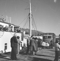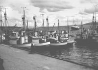 RMS St. Ola approaching Stromness Pier, c.1960. In the foreground are Norwegian fishing boats preparing for the whaling season.