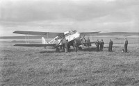 An Aberdeen Airways De Havilland Dragon at Cumminess, Stenness, date unknown. The man 2nd from right is Dr. Shaw G.P., father of Robert Shaw, actor. F. Muir is on the right.