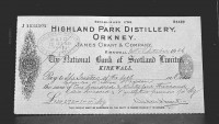 A National Bank of Scotland cheque from Highland Park Distillery to the Trustees of the late Charles Mathew Haydon, dated 6/10/1936, for just over £134,692.