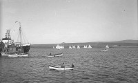 The naming ceremony for the new Longhope Lifeboat 'T.G.B.', 23rd August 1962. The naming was performed by the Hon. Mrs Ramsay. Lifeboat Coxswain Dan Kirkpatrick is on the left.