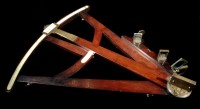 Brass and wood scientific instrument for measuring angles with an arc of 45 degrees. Used by Dr John Rae in the Artic.