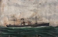 Painting "Hastings County", wrecked on Auskerry, 13th June 1924. Oil on plywood. Painted by "W. Cooper".