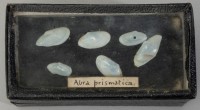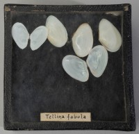 Class: Bivalvia. 23 specimens. 11 have both valves still attached, 7 left valves and 5 right valves. Very small, thin and semi translucent.