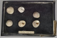 Class: Bivalvia. 3 specimens. 1 upper (right) valve and 2 lower (left) valves. The two smaller specimens in this box have an orange tinge to their internal surfaces.