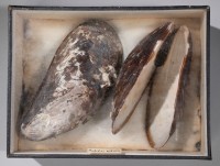 Class: Bivalvia. 2 specimens. Both have both valves still attached at the hinge. Large, tear-drop shaped and thick. A blue periostracum with the shell beneath paler blue or purplish.