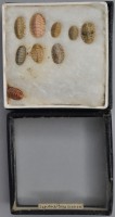 Class: Polyplacophora. 9 specimens. Oval-shaped, ridged. Pinks and greys, several have striped markings.