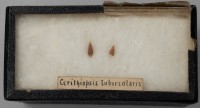 Class: Gastropoda. 4 specimens. 2 of which are contained within their own capsules. White and conical with defined whorls and crosshatched ridging.
