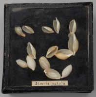 Class: Gastropoda. 14 specimens. Semi-translucent, white with an orange tinge. Elongated-oval in shape with a wide aperture that stretches the length of the shell.
