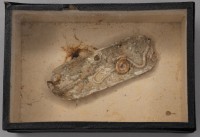 Class: Polychaeta. Small piece of what looks to be bone with 4 examples of keel worm calcareous tubes adhered, some of which are very coiled. There is also barnacle epibionts (Balanus balanus).