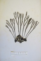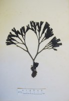 Pressed seaweed specimen. Small dark red stalk with 6 leaves.