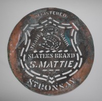Copper herring barrel stencil. Slaters brand. Matfull. Stronsay.